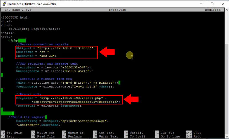 After you pasted the php code modify the Server connection, change the URL, username and password to your SMS Gateway IP and HTTP API user username and password. Then modify the Report URL-s IP to the Apache webserver IP (Figure 6).